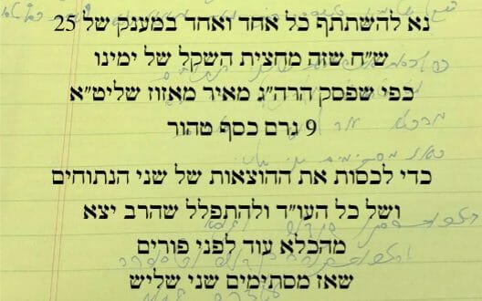 נא להשתתף כל אחד ואחד במענק של 25 ש"ח שזה מחצית השקל של ימינו כפי שפסק הרה"ג מאיר מאזוז שליט"א,