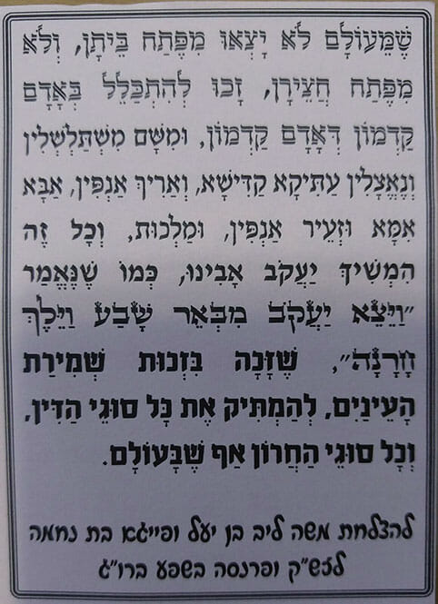 תפילה להתכלל בצדיק שכולו נעלם בייחוד הנעלם – לזכות לשמירה והגנה מעין רעה בזכות פחד יצחק, ולזכות לעין טובה כמו יעקב, ויתבטלו מעלינו כל הדינים שבעולם