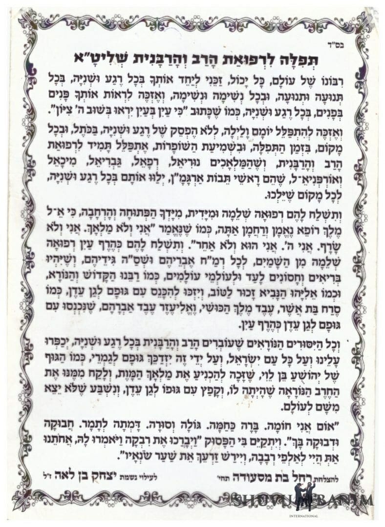 מצבו הבריאותי של הרב שליט"א אינו טוב וכל מי שמגיע לתפילות עם הצדיק רואה זאת בנקל. הרב מוסר נפש עד טיפת הדם האחרונה שלו, וזה לא רק ביטוי, זאת האמת ממש. לכן אנו מביאים את התפילה המפורסמת לרפואת הרב והרבנית בכדי שלכל אחד מאיתנו יהיה סדר קבוע של תפילה על הצדיק, כ"ק מורינו הגה"צ הרב אליעזר ברלנד שליט"א שכל כולו מסירות נפש על עם ישראל.