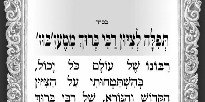 לפניכם תפילה שכתב הגה"צ רבי אליעזר ברלנד שליט"א לציונו הקדוש של רבי ברוך בן השוכן צמוד לציון הבעל שם טוב זיע"א במעז'יבוז' שבאוקראינה:
