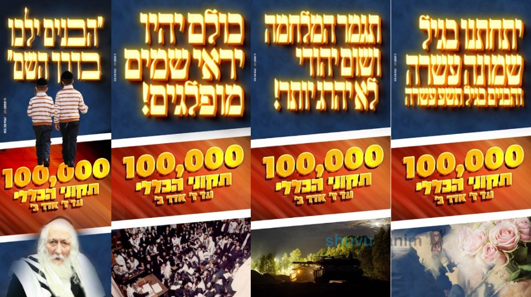 בימים האחרונים התעוררו אנשי הצדיק, לערוך קמפיין לאמירת מאה אלף תיקוני הכללי לסיום המלחמה, השבת החטופים ועצירת ההריגות הנוראות ה"י. הקמפיין נוצר בעידודו של הגה"צ רבי אליעזר ברלנד שליט"א, אשר בירך באופן מיוחד את המשתתפים בקמפיין לכל מילי דמיטב.