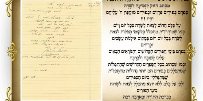 מִכְתַּב חִזּוּק לַנְּסִיעָה לַשָּׂדֶה בִּפְרָט בְּפוּרִים פְּרָזִים וּבְפוּרִים מוּקָפִין ה' עֲלֵיהֶם יִחְיוּ !!!