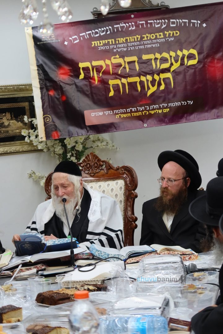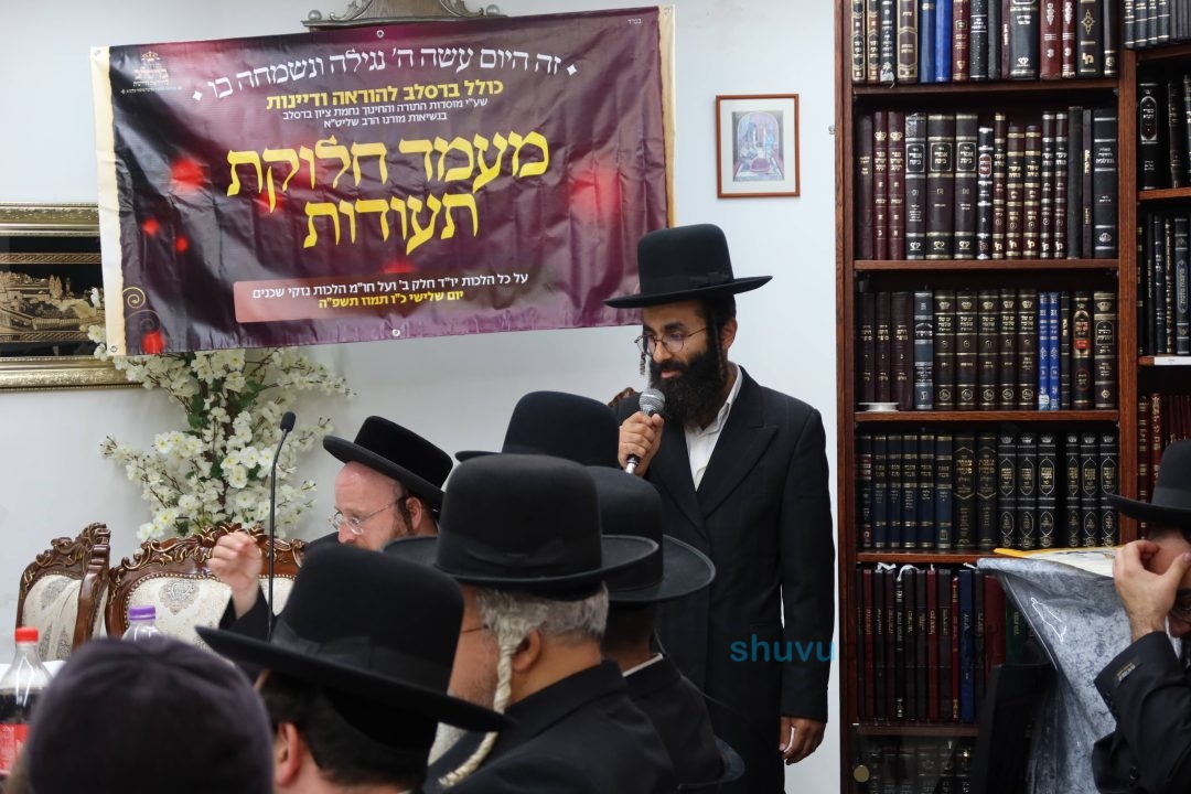 המעמד נפתח עם דבריו של הרה"ג ר' נחמן כהן שליט"א ששיבח את האברכים החשובים אשר יושבים ועומלים ולומדים בחשק רב את ההלכות הנ"ל אשר הם מההלכות הקשות בדיינות. עוד הוסיף ראש הכולל לדבר על היקף הידיעה העצום אליו הגיעו האברכים ע"י הלימוד והמבחנים. לאחר מכן דיברו חברי הבד"ץ הרה"ג ר' עמרם הופמן שליט"א, הרה"ג ר' סנדר ארבנפלד שליט"א, אשר רוממו את האברכים אשר נבחנו בפניהם על מנת לקבל את תעודת הבד"ץ המעידות על ידיעותיהם הרבות, ר' סנדר הוסיף אין זה בסתם שרואים את הרוח הזו, כי אם מראש המטות – מורינו הרב שליט"א שמכניס בהם את רוח השקידה בלימוד התורה הקדושה. עם סיום הדברים נכנס מורינו הרב שליט"א למעמד ונשא מדברות קודשו.