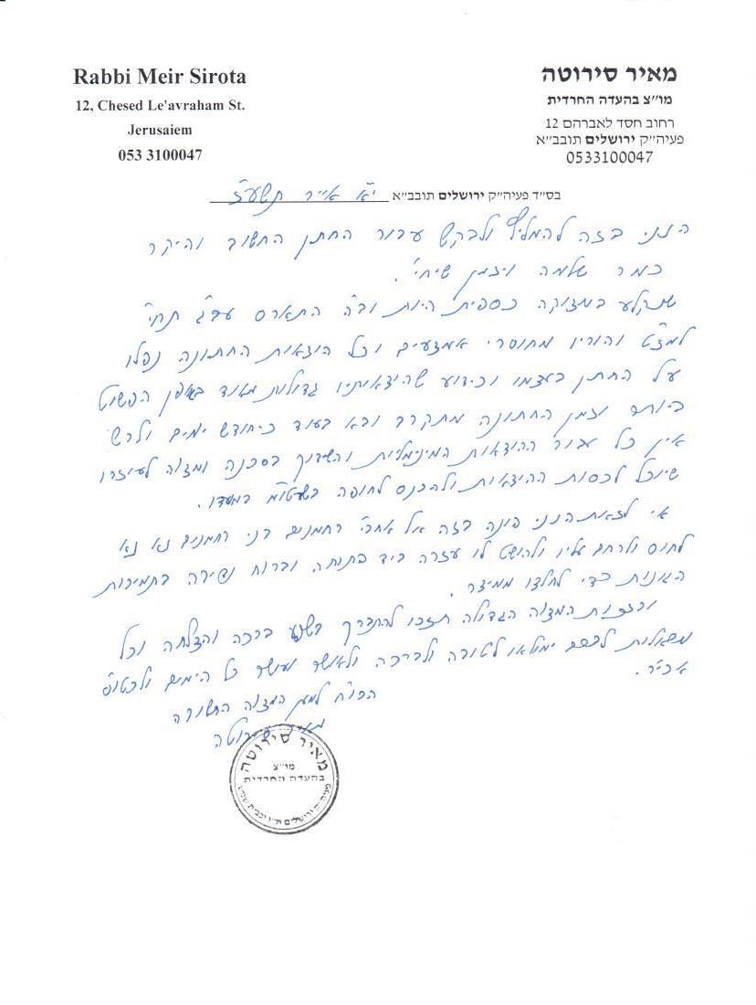 המלצתו של הגה"ח הרב מאיר סירוטה, מו"צ העדה החרדית בעיה"ק ירושלים