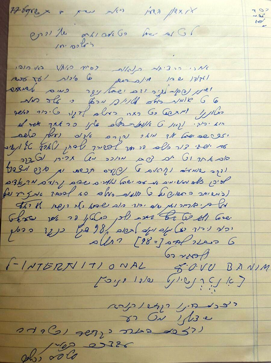 להיפך, כולם מאשימים את עם ישראל ואומרים שהם גרועים מהנאצים, והמשימה הראשונה של כל אומות העולם היא להכחיד את זרע ישראל מעל פני האדמה. ואין שום יהודי כיום שהוא בטוח בנפשו, לא בארץ ישראל, ולא בכל ארץ אחרת. ולכן החלטנו פה אחד שעל כל יהודי ויהודי בכל מקום ומקום לתרום 98 שקל כנגד הפסוק 'כל הַכתוּב לַחַיִּים בִּירוּשָׁלִָם'”.