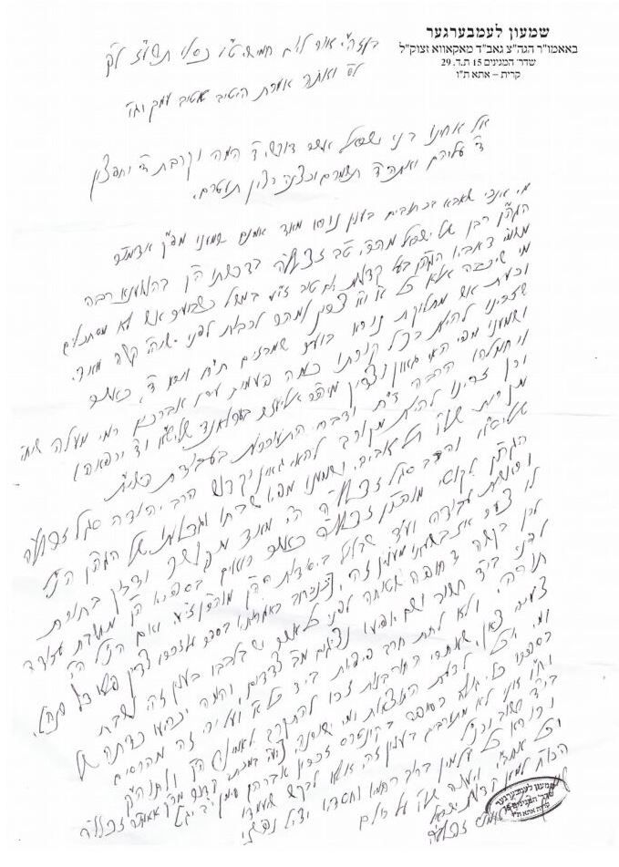 וח״ו אנו לא מתערבים בענין זה, אלא לבקש שיעמידו בי״ד חשוב וכנ״ל ובורא כל עלמין ברוב רחמיו וחסידו יציל נפשינו וכל אחב״י ויעשה שלו' על כולם הכו״ח למען קדושת ישראל שמעון לעמבערגער בלאמו״ר זצלל״ה.