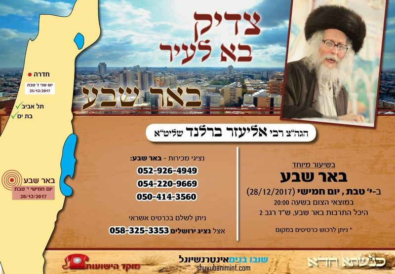 [audio mp3="https://cdn.sanity.io/files/ikrbg3ic/production/e22b583edc95dfc45466a0506baa55c476d87cef.mp3" autoplay="true"][/audio]"באר שבע היא המקום בו אברהם קרא בשם ה', באר שבע זה המקום הכי קדוש בעולם ששם נחפרו השבע בארות שכולם ינקו מבארה של מרים. כל מי שיבוא לכנס בבאר שבע יזכה לבארה של מרים ויתרפא מכל המחלות שלו, של הוריו, דודיו, זקניו. מי שיבוא לכנס יהיה לו את הכוח להחיות מתים. איש בל ייעדר, חובה על כולם לבוא לכנס ב- י' טבת ביארצייט של ר' נתן מברסלב, שהיום הזה גדול יותר מיום כיפור. כי החורבן היה נורא כשראו את נבוכדנצר מתקרב לשערי ירושלים, ועכשיו ב- י' בטבת מחזירים את ירושלים לשורשה, לעם ישראל ובזכות שכולם יגיעו לכנס נזכה לגאולה השלמה במהרה בימינו אמן.