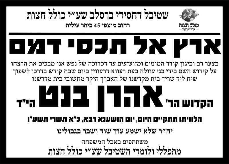 → חזרה לכל המאמריםשינוי מיקום ההלוויה של הקדוש אהרן בנט4 באוקטובר 2015•עורך ראשיחדשות,מבזקים📖הדפסהשתף בוואטסאפשינוי מיקום ההלוויה של הקדוש אהרן בנט תצא מבית הלוויות שמגר להר המנוחות ולא להר הזיתים. סופית. → המאמר הקודםפרטי הלוויתו של הקדוש אהרן בניטה ז"להמאמר הבא ←תמונות ממסע הלוויה של הק' אהרן בניטה הי"דהירשמו לניוזלטרקבלו מאמרי תורה והתחזקות ישירות לתיבת הדואר שלכםהרשמה→ חזרה לכל המאמרים