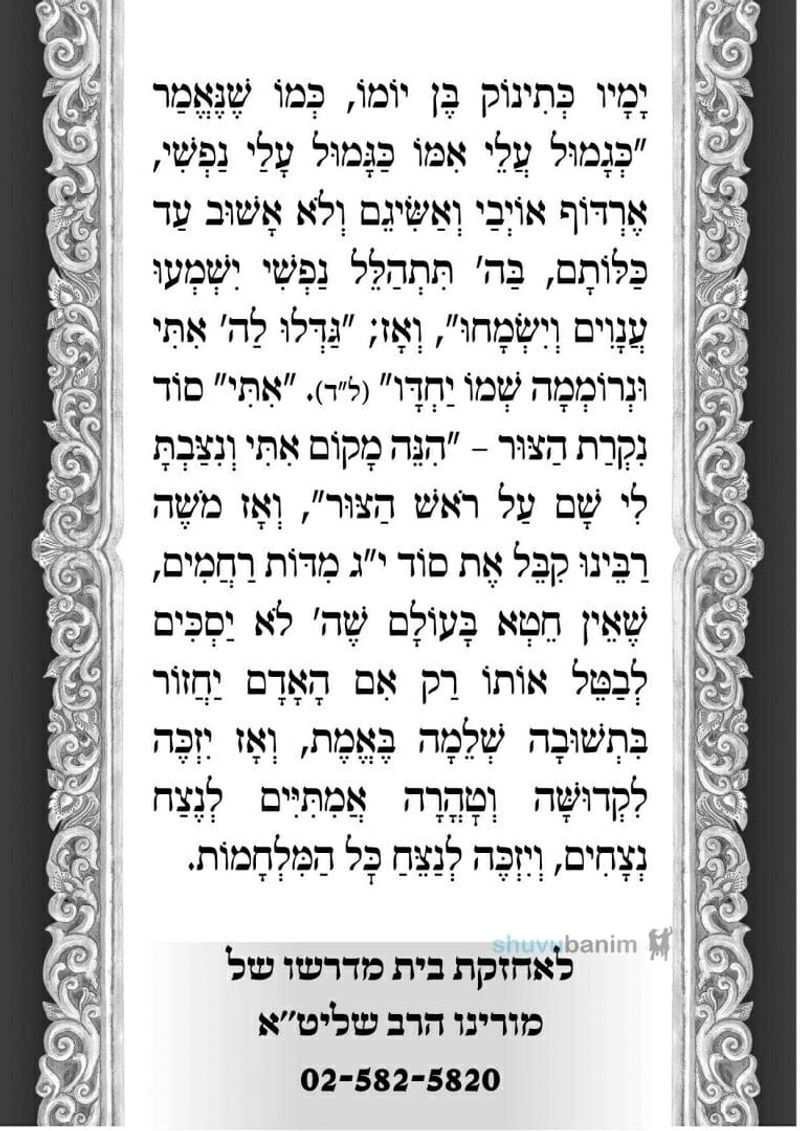 → חזרה לכל המאמריםסוד נקרת הצור מתגלה בהוד שבנצח - תפילה לספירת העומר11 במאי 2022•חדשות שובו בניםהוד שבנצחספירת העומרתפילההדפסהשתף בוואטסאפסוד נקרת הצור מתגלה בהוד שבנצח - תפילה לספירת העומר ממורינו הגה"צ רבי אליעזר ברלנד שליט"א היום ששה ועשרים יום שהם שלשה שבועות וחמישה ימים לעומר - "הָרַחֲמָן הוּא יַחֲזִיר לָנוּ עֲבוֹדַת בֵּית הַמִּקְדָּשׁ לִמְקוֹמָהּ, בִּמְהֵרָה בְיָמֵינוּ אָמֵן סֶלָה" לפניכם תפילה להוד שבנצח: → המאמר הקודםההכנה לל"ג בעומר - שיעורו של הרה"ח הרב עופר ארז שליט"אהמאמר הבא ←שיעור לאברכי כולל 'נחלי נצח' בבית מורינו הגה"צ הרב אליעזר ברלנד שליט"אהירשמו לניוזלטרקבלו מאמרי תורה והתחזקות ישירות לתיבת הדואר שלכםהרשמה→ חזרה לכל המאמרים
