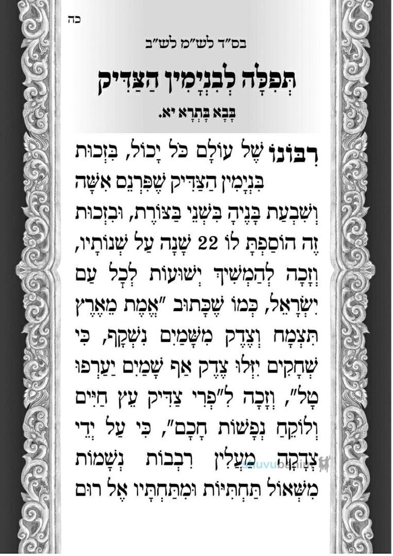 "רִבּוֹנוֹ שֶׁל עוֹלָם כָּל יָכוֹל, בִּזְכוּת בִּנְיָמִין הַצַּדִּיק שֶׁפִּרְנֵס אִשָּׁה וְשִׁבְעַת בָּנֶיהָ בִּשְׁנֵי בַּצֹּרֶת..."
