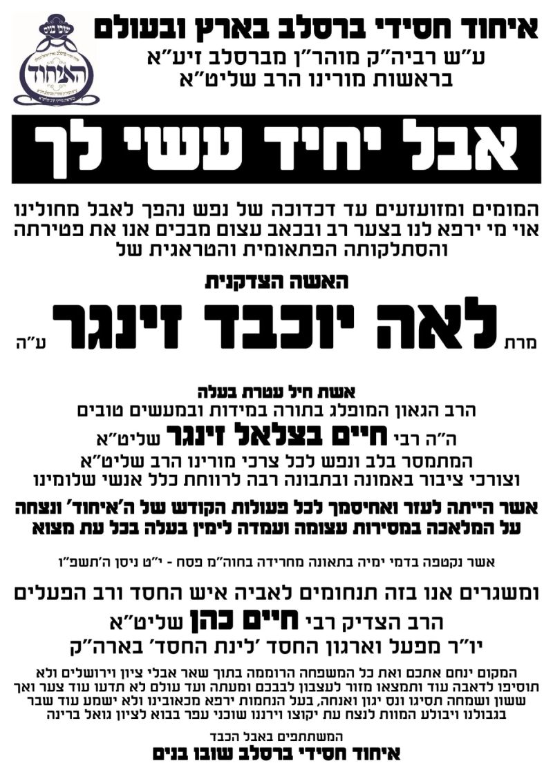 אבל כבד ירד על עם ישראל ועל קהילת ברסלב שובו בנים בפרט עם השמע הטרגדיה הנוראה על הלקחה של האשה הצדקנית מרת לאה זינגר ע"ה אשר נקטפה בדמי ימיה בעיצומו של חול המועד פסח בחזור מקברי צדיקים בבולגריה