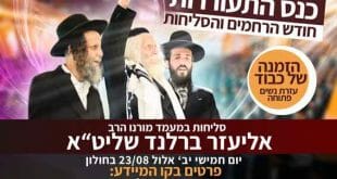 בליל שישי דפרשת כי תצא, י"ב אלול, ה- 23.8.18 נערך כנס ההתעוררות והסליחות הגדול בחולון יחד עם כ"ק הגה"צ הרב אליעזר ברלנד שליט"א. הרב שליט"א הגיע לאולם בית המדרש שהיה גדוש בחסידים, רבנים, אנשי מעשה ועמך ישראל שהצטופפו בהתרגשות לבואו של הצדיק. לפני שמסר הרב ברלנד שליט"א את דברי קודשו עלה לדבר הרה"ג הרב עופר ארז שליט"א וכן כיבדו בנוכחות הרב …