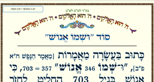 כמה שנים אנוֹש עבד עבודה זרה? ומהו סוד שמו אנוֹש? את התשובות לשאלות תמצאו במאמר היומי שלפניכם שכתב אותו הבוקר הגה"צ רבי אליעזר ברלנד שליט"א מלא וגדוש בחידושים נפלאים שלא שמעתם אוזן. לפניכם המאמר המלא לקריאה ולהורדה באדיבות עלון 'ה' הוא האלוקים': סוֹד "וּשְׁמוֹ אֱנוֹשׁ" כתוב בעשרה מאמרות [מאמר הנפש ח"א פ"ב], "וּ־שְׁמוֹ 346 אֱנוֹשׁ" 357 = 703, כי אנוֹש …
