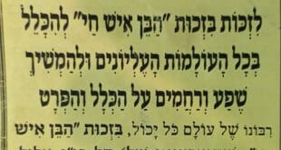 תפילה להילולת "הבן איש חי" הרב יוסף חיים מבגדאד זצ"ל חי בין השנים כ"ז באב ה'תקצ"ה, 2 באוגוסט 1835, י"ג באלול ה'תרס"ט, 30 באוגוסט 1909. לִזְכּוֹת בִּזְכוּת "הַבֵּן אִישׁ חַי" לְהִכָּלֵל בְּכָל הָעוֹלָמוֹת הָעֶלְיוֹנִים וּלְהַמְשִׁיךְ שֶׁפַע וְרַחֲמִים עַל הַכְּלָל וְהַפְּרָט חלק 2