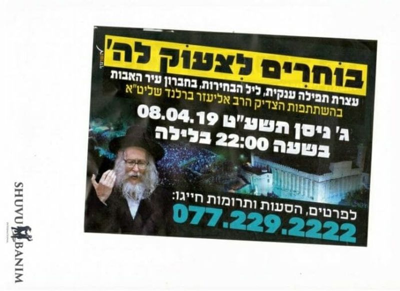 Rabbi Berland announces another prayer gathering to take place in Hevron, on Zot Chanuka, 5779.