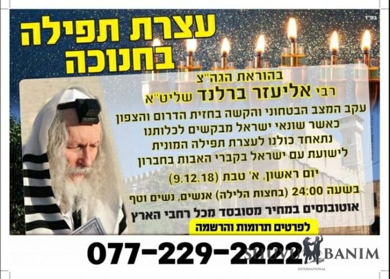 âThe Rav is asking everyone to please come to the prayer gathering, because this thing is extremely important to me. The Rav is currently in life-threatening danger, so everyone has an obligation to come to the gathering, without any exceptions. From all the classes, from all the different groups of people, chilonim, religious people, kipot srugot (knitted kippas, i.e. National Religious), black kippas â it doesnât matter how they dress. âEveryone is obliged to come to the gathering that is taking place for the hatzlacha (success) of Am Yisrael, and in order to prevent a new intifada. That they shouldnât fire more rockets at the South, or at the North, and that no more Jews should be injured, until Moshiach ben David will come and rectify everything.â The Rav stressed in his conversations that the main point of the gathering is to stop a war from breaking out in Israelâs south, and also in Israelâs north. == December 4th, 2018 IDF begins Operation Northern Shield, to blow up tunnels being dug into Israel by the Hezbollah, in the North of the country. Rabbi Berland continues to urge people to attend the Prayer Gathering in Hevron on Zot Chanuka, saying:Â âThis matter is very close to my heart. I am life-threatening danger, mamash.â