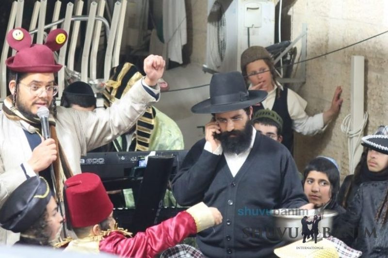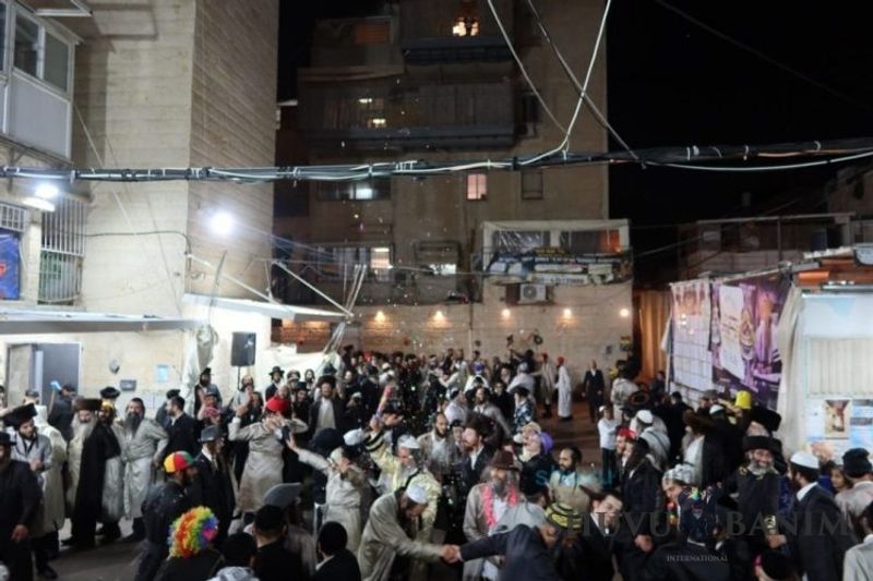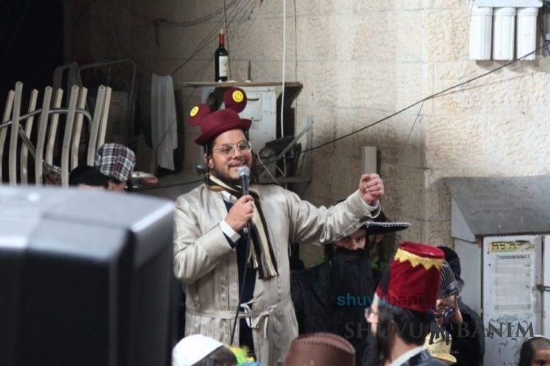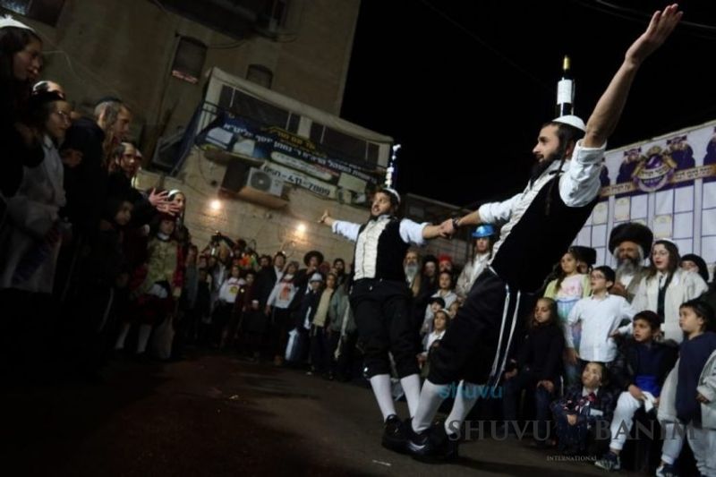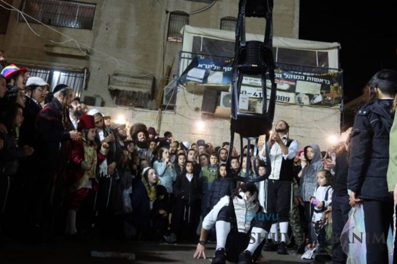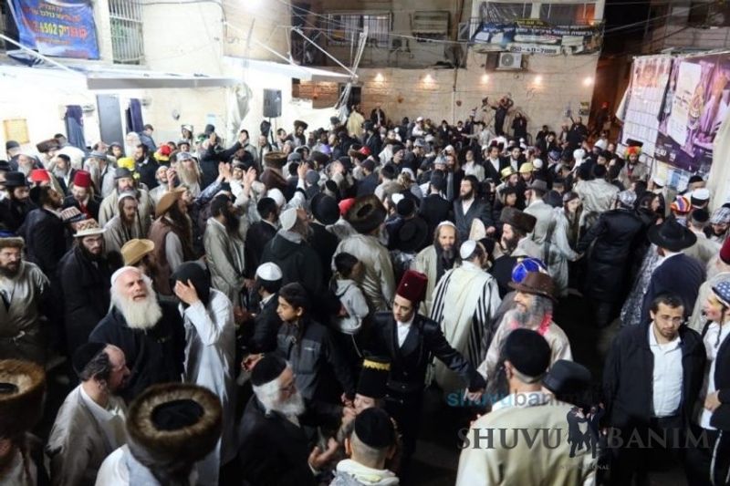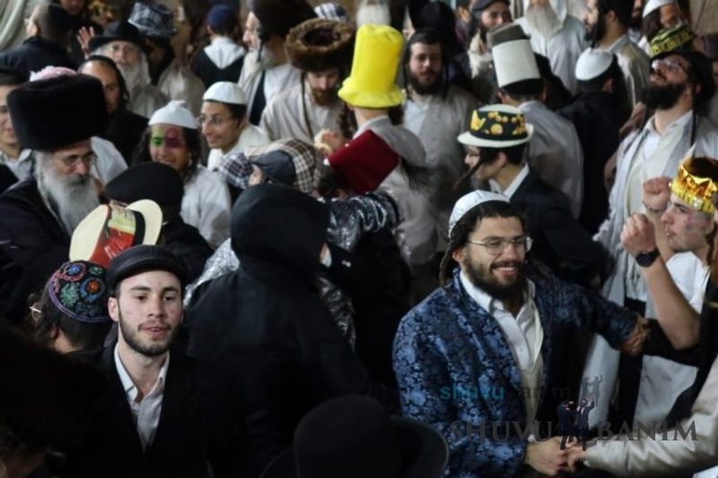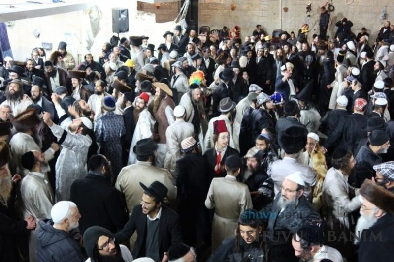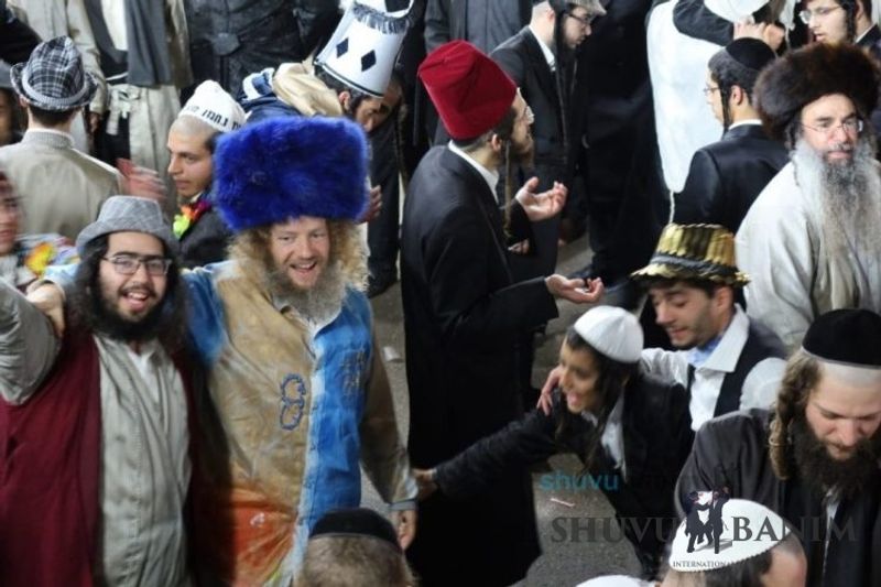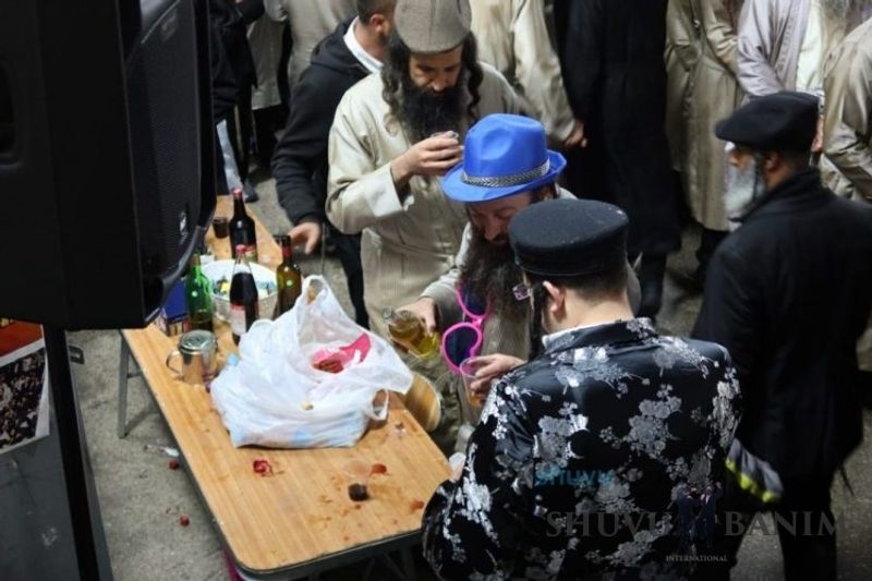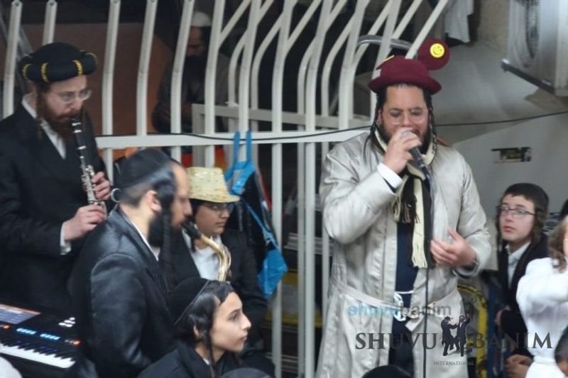 Everyone knows that anyone who wants to experience the true joy of Purim should go to the courtyard of the king’s palace – our Beit Midrash, Shuvu Banim. Like every year, the Purim celebrations were held with adornment that is not found in any place in the world. Unlike previous years, this year, the management of the synagogue did not receive financing from any source for an orchestra or amplification. However, the Gabbai of the synagogue, the dedicated R’ Etiel Yisraeli took onto himself a debt of 5,000 NIS so that the Purim celebration will be in each and every generation, and the salvation of the congregation of Shuvu Banim will be forever. The holy work of music was conducted by the musician R’ Natan Marian, and on the keyboard was R’ Natan Guddes, and the bachurim Simcha Zakai and Yehuda Kohen. At their sides were R’ Nachman Druk on the clarinet and R’ Natan Raz on the saxophone. The Purim feast and dancing began at 1:30 PM, after Minchah Gedolah in our Beit Midrash, with more and more people flowing in from Jerusalem and even from other cities. Wine was distributed to the dancers in order to continue the mitzvah of the day. There is no doubt that such simcha is not found anywhere. As the Rav shlit”a desired, the people were only slightly tipsy, but not drunk. The simcha was true simcha, breaking all boundaries, but without wildness. In the midst of the celebrations, the dancing duo of Shimon Elbaz and Nachman Alshich arrived, who pumped up the rhythm of the simcha with phenomenal and breathtaking performances. Close to 9:30 PM, when the square was already overflowing with thousands of dancers, the songs of emotional arousal began, with the whole congregation of Shuvu Banim joining hands with wondrous and rousing unity. The peak was the song “Acheinu Khol Beit Yisrael – Our brothers, all the House of Israel...” Even the tipsiest person could not remain indifferent to this rousing sight. Close to 10:05 PM, Moreinu HaRav shlit”a entered his balcony for Ma’ariv at the end of this holy day. The joy became many times greater with the song “Or Zarua La’Tzaddik...” This was followed by Ma’ariv and the Breslov melodies of every evening.Photo gallery courtesy of Hitchadshut Magazine – all rights reserved for them: