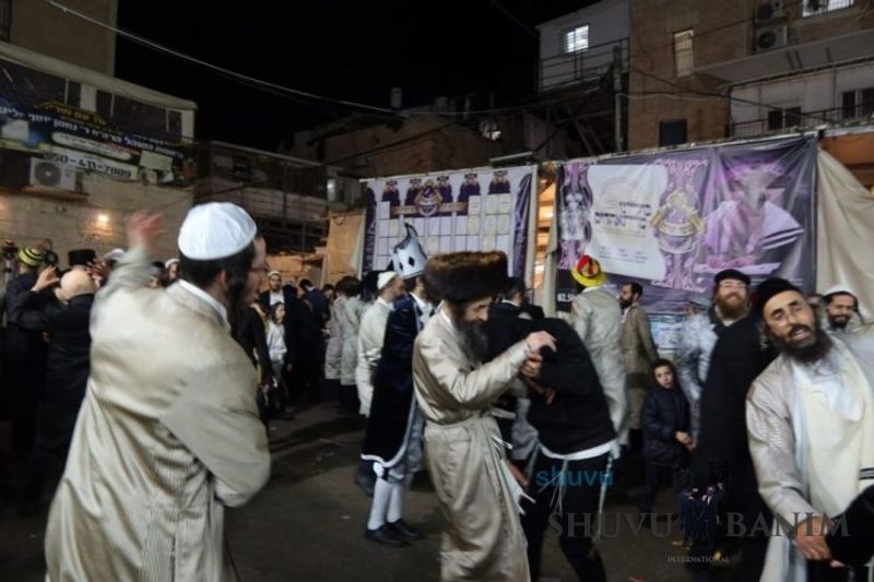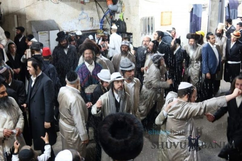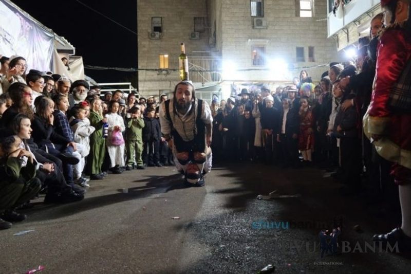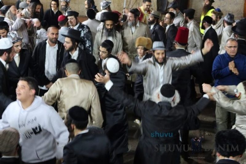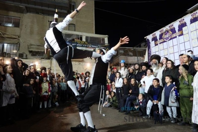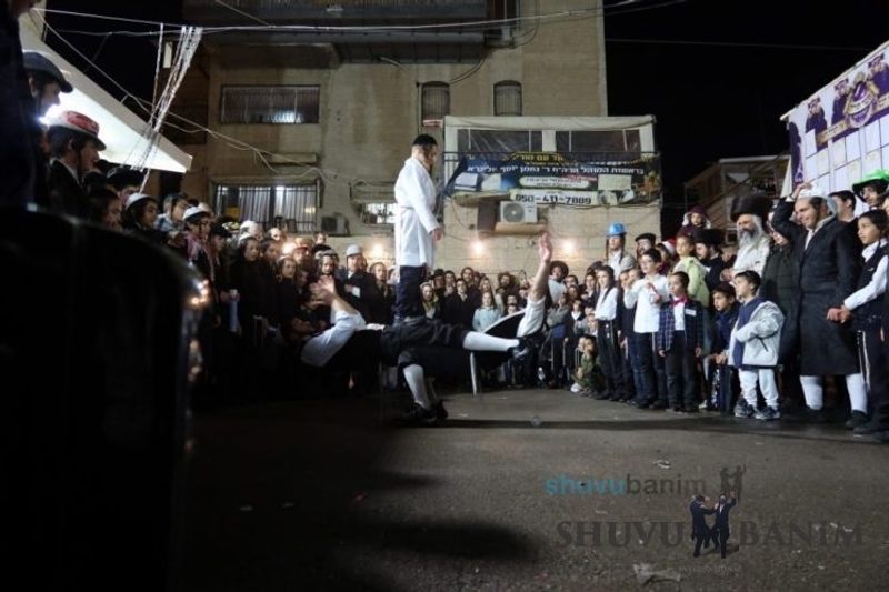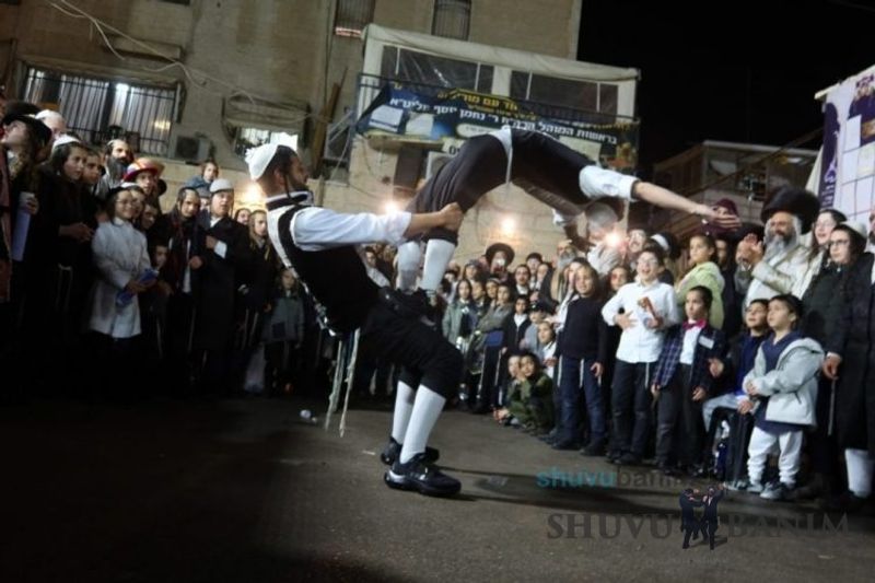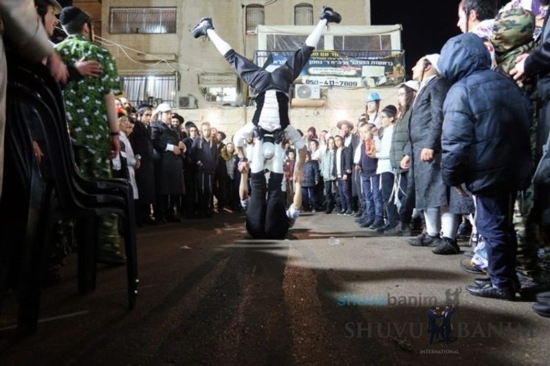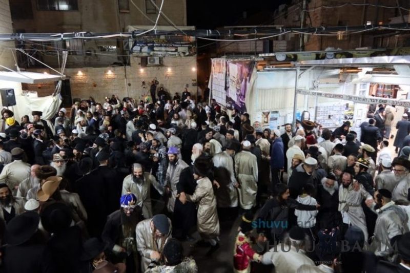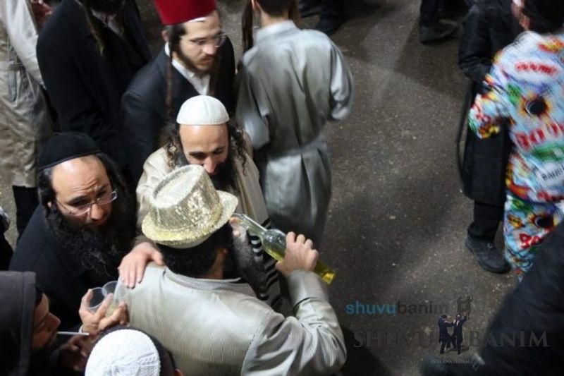 Everyone knows that anyone who wants to experience the true joy of Purim should go to the courtyard of the king’s palace – our Beit Midrash, Shuvu Banim. Like every year, the Purim celebrations were held with adornment that is not found in any place in the world. Unlike previous years, this year, the management of the synagogue did not receive financing from any source for an orchestra or amplification. However, the Gabbai of the synagogue, the dedicated R’ Etiel Yisraeli took onto himself a debt of 5,000 NIS so that the Purim celebration will be in each and every generation, and the salvation of the congregation of Shuvu Banim will be forever. The holy work of music was conducted by the musician R’ Natan Marian, and on the keyboard was R’ Natan Guddes, and the bachurim Simcha Zakai and Yehuda Kohen. At their sides were R’ Nachman Druk on the clarinet and R’ Natan Raz on the saxophone. The Purim feast and dancing began at 1:30 PM, after Minchah Gedolah in our Beit Midrash, with more and more people flowing in from Jerusalem and even from other cities. Wine was distributed to the dancers in order to continue the mitzvah of the day. There is no doubt that such simcha is not found anywhere. As the Rav shlit”a desired, the people were only slightly tipsy, but not drunk. The simcha was true simcha, breaking all boundaries, but without wildness. In the midst of the celebrations, the dancing duo of Shimon Elbaz and Nachman Alshich arrived, who pumped up the rhythm of the simcha with phenomenal and breathtaking performances. Close to 9:30 PM, when the square was already overflowing with thousands of dancers, the songs of emotional arousal began, with the whole congregation of Shuvu Banim joining hands with wondrous and rousing unity. The peak was the song “Acheinu Khol Beit Yisrael – Our brothers, all the House of Israel...” Even the tipsiest person could not remain indifferent to this rousing sight. Close to 10:05 PM, Moreinu HaRav shlit”a entered his balcony for Ma’ariv at the end of this holy day. The joy became many times greater with the song “Or Zarua La’Tzaddik...” This was followed by Ma’ariv and the Breslov melodies of every evening.Photo gallery courtesy of Hitchadshut Magazine – all rights reserved for them: