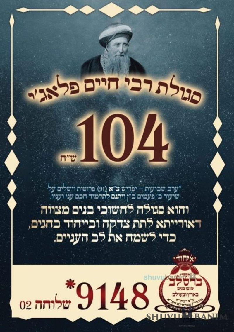 This year on Erev Chag HaShavuot 5784, upon the instruction of the greatest students of our Rebbe Rav Eliezer Berland shlit"a, we give the money for the segula to "United Chasidei Breslov Shuvu Banim" to support Kollel students in our holy community.