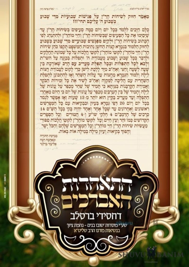 As was previously publicized, it has been decided, bezrat Hashem, to establish a group of Avreichim (Kollel students) in our holy community, Shuvu Banim. We are now publicizing for the first time a letter from Moreinu HaRav Eliezer Berland shlit”a which encourages the weekly meetings, and, likewise, the study of the book Chayei Moharan. Here is the full letter:
