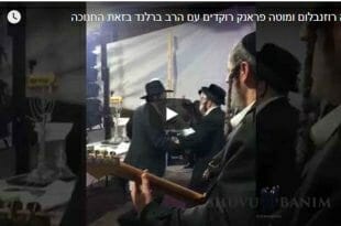 היוצר המוזיקלי הדגול מונה רוזנבלום והמשפיע הרוחני הרב מוטה פראנק בריקודי קודש עם הגה"צ הרב אליעזר ברלנד שליט"א במעמד המרגש של 'זאת החנוכה' ברח' החומה השלישית.